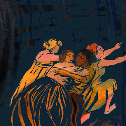 I wanted a wood block effect, so, after drawing the women, I filled in the line and some shapes with the blue. I was happy with the Photoshop coloring of the line, but I wanted something warmer and more complex and luminous for the coloring on the women. I painted their coloring with oil paint on canvas (see below) and then overlapped it with the drawing. I was happy with this approach because now the women seem aglow with the consuming fires of Gerald.